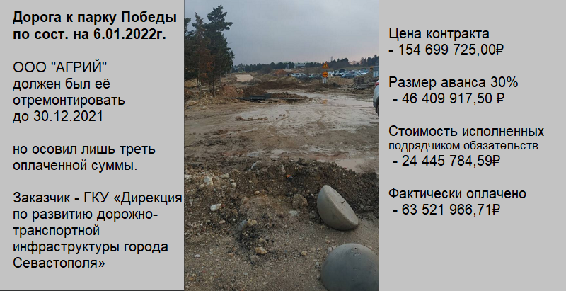 Контракт на "капитальный ремонт автомобильной дороги общего пользования межмуниципального значения 67 Н-216 ул. Подъезд к парку Победы" был заключен 23.12.2020 с компанией ООО "АГРИЙ" (ИНН 9102192386) со сроком исполнения 30.12.2021 Заказчик - ГКУ «Дирекция по развитию дорожно-транспортной инфраструктуры города Севастополя» (сокр. ГКУ "Дирекция"). Цена контракта - 154 699 725,00₽ Размер аванса 30%, что составляет 46 409 917,50 ₽
