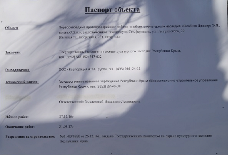 Кстати, проект производства работ на реставрацию особняка Э. Я. Динцера, Республика Крым, г. Симферополь был заказан компанией ООО "КОРПОРАЦИЯ АТТА ГРУПП" инженерному бюро ООО "ФиП. Проект в ноябре 2017 года, об окончании которых бюро сообщило 13 июня 2019г.
