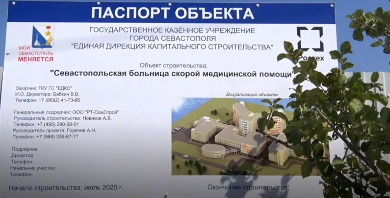 Контракт на выполнение работ по строительству объекта: «Севастопольская больница скорой медицинской помощи» был заключен с ООО «РТ-СоцСтрой» 15.06.2020 со сроком 31.12.2023. Цена контракта 7 580 893 430,00 ₽, из них строительные работы составляют 4 704 807 607,90 ₽. По состоянию на ноябрь 2021г. фактически оплачено 2 413 072 716,47 ₽